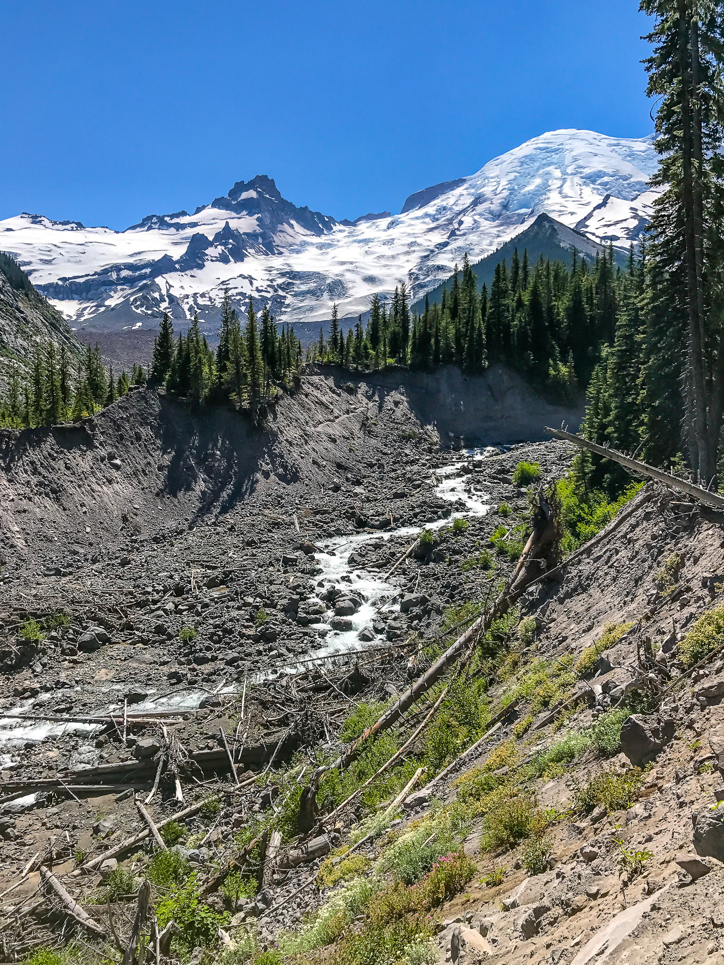 There’s a log bridge that lets you safely cross the river and this is where access to the Emmons Moraine trail begins. You can makeout the bridge in the above photo, as long as the switchback that takes you onto the ridge.