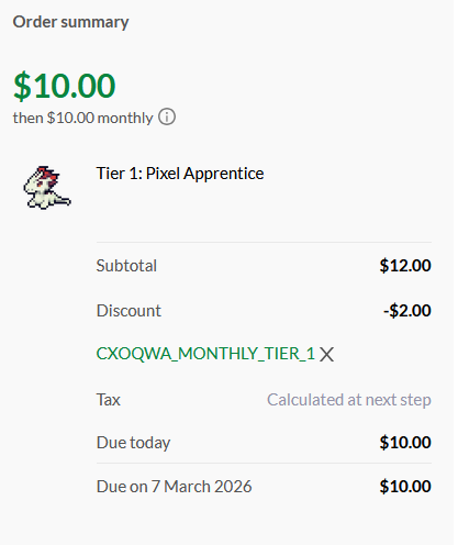 Tier 1 ($2 discount): CXOQWA_MONTHLY_TIER_1
